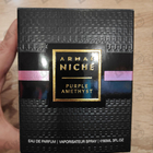 ПАРФЮМЕРНАЯ ВОДА ARMAF NICHE PURPLE AMETHIST Аромат насыщенный, громкий, обволакивающий сладкий, но не навязчивый, стойкий, не обычный, заметный, выделяется своим звучанием из всех имеюшихся у меня ароматов данной коллекции. Стойкость и шлейф великолепные, на одежде и волосах очень долго держится, комплиментарный. Прекрасное оформление, флакон приятно держать в руках, покупкой очень довольна, соотношение цена и качество на высоте, буду носить с удовольствием.