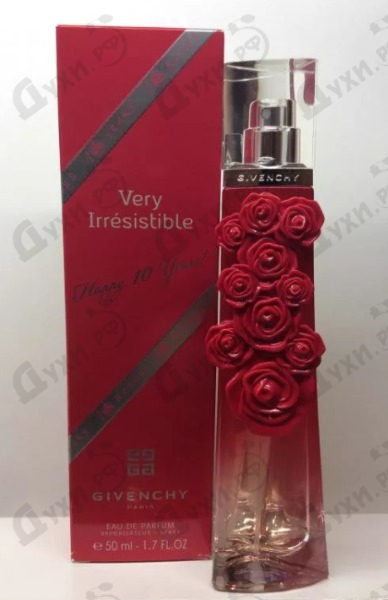 К 10-летию после выпуска невероятно популярного аромата «Very Irresistible» торговый дом Givenchy выпустил лимитированную линию духов под названием «Very Irresistible Happy 10 Years», появившимся в продаже 2013 года. Эта версия была создана на основе десятка роз, таких нежных, ароматных и естественных, как и сам запах. Флакон этого парфюма очень женственен и красив, особенно если учесть декорацию бутылочки десятью розами. Оригинальная линейка парфюма переводится как «Самые непреодолимые», причем аромат этих духов именно так и выражает свои запахи: все непреодолимые и заветные желания будут исполняться, а стойкий запах роз перемежается с терпким мускусом и анисом, придавая ему чувственности и особой нежности. Эфирные масла болгарской, дамасской, марокканской роз, розового сорта розы Emotion и красной розы обладают очень элегантным и непринужденным запахом, заключенном в одном небольшом флаконе от Givenchy. Любая женщина будет довольна ярким шлейфом от этого парфюма.