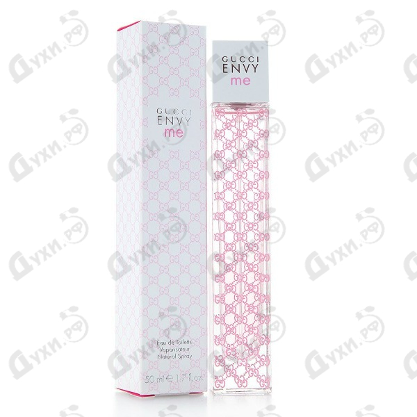 Девиз парфюмерного образца с зажигательным названием «Завидуйте мне» помещен в продолговатый сосуд с острыми углами, призванный передать гордость и индивидуализм необыкновенной туалетной воды. Женственность парфюма Gucci Envy Me передана нежностью мелкого рисунка в розовом цвете, который придает композиции изысканный и очаровательный вид.