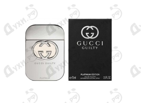 Guilty Platinum от Gucci нацелен на женскую аудиторию на все 100 процентов. К слову, запах ориентирован на поклонниц восточных веяний. Ароматная новинка Guilty Platinum віпущен в 2016 модным брендом Gucci. Начальные нотки при знакомстве увлекают нас ароматами розового перца и ароматной герани. Эффект, получаемый при смешении гармоничных оттенков сирени с волшебными нюансами нежнейшего персика в сердце парфюмерного букета, несёт непередаваемые ощущения. Этот аромат надо лишь ощущать рядом, не иначе. Он не поддается описанию на бумаге… или, напротив, о нём можно писать бесконечно, боясь упустить что-то важное… Однако, облагораживает созданный букет ещё и парфюмерный тандем из аккордов пачули и амбры. Флакон стальной будто платиновый, вызывает интерес также нанесенным тесненным изображением. По всей видимости, создатель работал над темой характера деловой женщины, придумывая данный аромат.