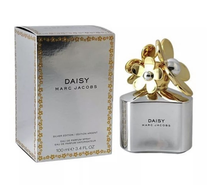 На упаковке Marc Jacobs Daisy Silver также грешно не остановиться поподробнее. Для парфюмерного букета с удивительными характеристиками создатели выбрали серебристую оболочку округлый флакон из непрозрачного искрящегося стекла, декорированный изящным колпачком с двумя обворожительными цветками золотистой тональности.