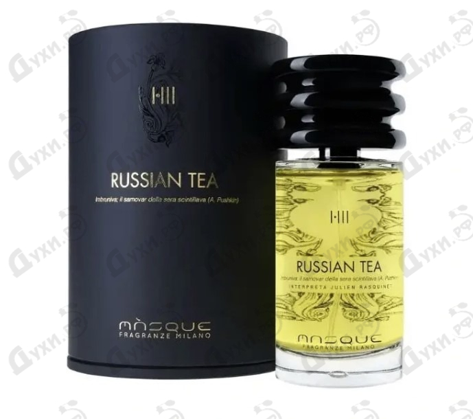 Russian Tea – это универсальный аромат, который прекрасно дополнит образ как мужчин, так и женщин. Парфюм презентован в 2014 году итальянским брендом Masque Milano. В разработке принимал участие Жульен Раскинет. Букет духов относится к группе ароматических и пряных запахов. Их звучание очень непростое. Оно интригует и завораживает. Композиция духов представляет собой взгляд иностранца на Россию. Это словно согревающий глоток обжигающего напитка, выпитого в морозном удивительном городе. Представьте себе прекрасный зимний Санкт-Петербург и его засыпанные снегом улицы. На Невском проспекте разместилась маленькая и уютная кафешка. В ней одинокий турист сидит за столиком, распивает чашку ароматного горячего чая и ностальгирует о своей родине. Он смотрит из окна на удивительную красоту, запечатленную в камне, и пытается понять традицию и любовь русских к этому восхитительному горячему напитку. Отдыхая иностранец наслаждается и запоминает прекрасные пейзажи и архитектуру, развернувшуюся вокруг. Невероятный ансамбль Russian Tea от Masque Milano начинается со свежих, пряных и ягодных аккордов. Здесь слышна ароматная прохладная мята, душистый и слегка горьковатый черный перец, яркая и сочная малина. К их симфонии присоединяется цветочно-травяной мотив, где играют в унисон красивая волнующая магнолия, сложный и многогранный бессмертник, терпкий и насыщенный черный чай. В финальной части композиции звучат древесно-мускусные ноты, представленные благородной и волнующей кожей, тяжелым и густым ладаном, теплой и мягкой березы, мускусный и чувственный лабданум. «Русский чай» идеально подойдет для зимней и осенней поры годы.