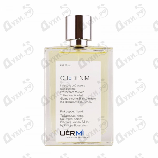 Oh ± Denim — утонченный, легкий, освежающий женский аромат, представленный итальянским парфюмерным брендом UER MI. Обладая непреодолимым желанием сотворить что-то необычное и эксклюзивное, благодаря множеству экспериментов, авторы разработали абсолютно новую интересную формулу формирования ароматных композиций. Они произвели на свет непревзойденный парфюмерный изыск, посвященный модной джинсе. Поразительная игра компонентов начинается несравненными специевыми переливами перца и нюансами нежных нероли. Интригующими оказываются сердечные мотивы, их размеренные и обаятельные вариации совмещаются с гармоничными аккордами восхитительного иланг-иланга и бархатистой туберозы. Неповторимая база духов поглощает в себя всевозможные чарующие оттенки манящей амбры, сладкой ванили, влажного дубового мха, соблазнительного мускуса и землистых пачули. Ароматическая композиция довольно чувственная, насыщенная, с глубокими переливающимися нотками. Великолепное творение прекрасно подойдет для использования в любое время года, окружая вас роскошным и престижным созвучием. Данный парфюм предоставляет потрясающую возможность ощутить роскошь джинсовой ткани, прочувствовать ее особенную красоту. Мода меняется с каждым днем, но данный материал не теряет своей популярности. UER MI Oh ± Denim, благодаря своей универсальности, в осенний и зимний период окружит вас теплым изыском, а в весеннее и летнее жаркое время подарит незабываемое ощущение свежести и прохлады. Он невероятным образом передает настроение и особенности характера своего обладателя. Каждая девушка, мечтающая привлечь к себе внимание, будет без ума от полученного результата, так как парфюм завораживает и манит ощущать его снова и снова. Все компоненты создают гармоничный тандем, обыгрывая и дополняя друг друга. В результате их взаимодействия между собой, каждая составляющая парфюма звучит абсолютно по-новому, интересно и необычно, обволакивая своим ароматом.