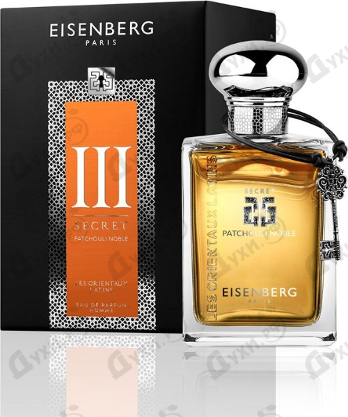 Eisenberg – это молодая французская компания, которая, несмотря на свой «юный возраст», уже произвела настоящий фурор на рынке косметической продукции и парфюмерии. Бренд создан Жозе Айзенбергом в 2000 году, но основанию предшествовали годы исследований и испытаний. Одним из достижений стало открытие революционной формулы Trio-Moleculaire, использование которой в кремах возвращало коже молодость, здоровье и сияние. Первый парфюм Айзенберг презентовал в 2002 году и это стал аромат «J’Ose». С годами бренд Eisenberg только наращивал свои обороты, помимо косметических средств и парфюмерии, они стали выпускать декоративную косметику. На сегодняшний день пластические хирурги мира оценили действенность продукта этой компании, они признали их качество, безопасность и разрешили использование в лечебной практике. В 2017 году парфюмерный и косметический дом Eisenberg представил свой новый мужской аромат, который назван Patchouli Noble Secret III. Букет одеколона содержит древесные и восточные ноты. Парфюм благородный, решительный и роскошный. Композиция Patchouli Noble Secret III берет свое начало с ноток пряного и пикантного перца, насыщенной и ароматной гвоздики, сладкого и яркого кардамона, теплой и уютной корицы, горячего и горьковатого мускатного орех, освежающего и тонизирующего лимона, а также свежего и терпкого бергамота. Далее ко вступлению присоединяются травяная и трогательная фиалка, роскошная и обворожительная роза, дымный и карамельный ветивер, загадочный и соблазнительный пачули, сильный и насыщенный шалфей, объемная и выразительная герань, приятная и расслабляющая лаванда. Финал обволакивает страстным и животным мускусом, нежной и восхитительной ванилью, сложными и жаркими бобами тонка, смолистой и дурманящей миррой, томным и карамельным бензоином, удивительным и необычным лабданумом, древесно-землянистым ирисом, сахарным и цветочным палисандром.