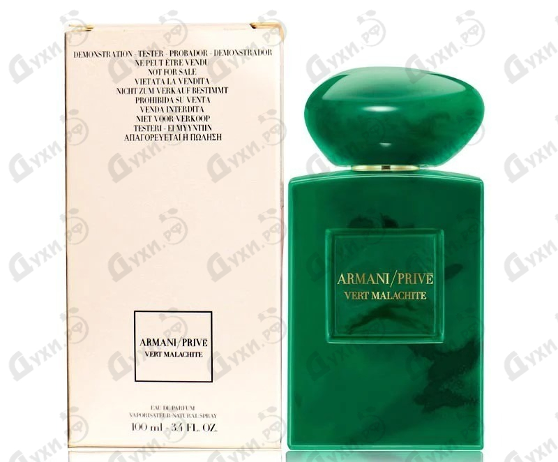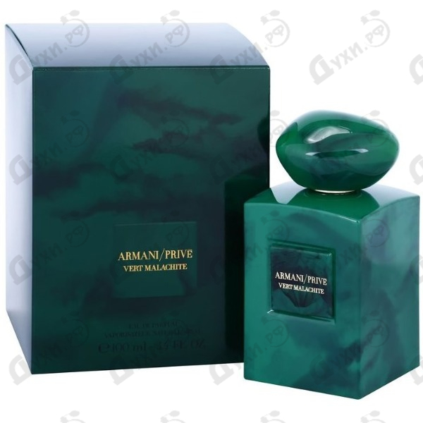 В 2016 году знаменитый модный дом Армани начал новую ароматную страницу, посвященную чуду драгоценных камней разных стран. В “La Collection de Terres Pr?cieuses” первая пара парфюмов была создана в честь России и удивительного минерала малахита. В Armani Prive Vert Malachite отражен многогранный и необыкновенный мир русской земли. Парфюмер Fabrice Pellegrin с помощью ароматических композиций отразил в парфюме непростой характер камня – хрупкий и твердый одновременно. Малахит служит для создания украшений, инкрустации стен, шкатулок и других интерьерных решений. Величественный камень самым лучшим образом отражен в изысканном благоухании сердечных аккордов лилии. Эту царственную красавицу окружают свежесть сочной зелени, легкая горчинка апельсина и жасмина самбака, иланг-иланг. Древесно смолистая базовая нотка бензоина и нежность ванили завершают многогранный и необычный аромат изысканного парфюма, который Джорджо Армани посвятил стране с характером полным невероятной энергии.