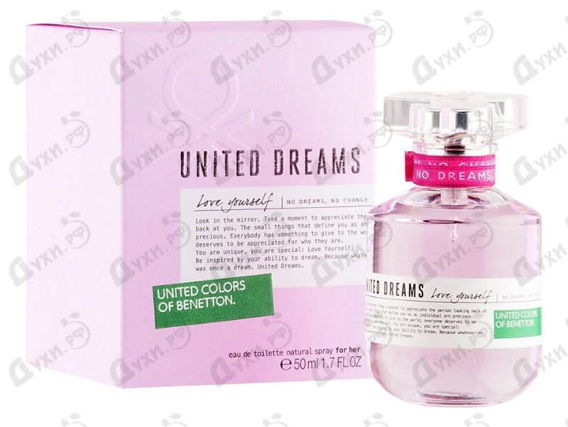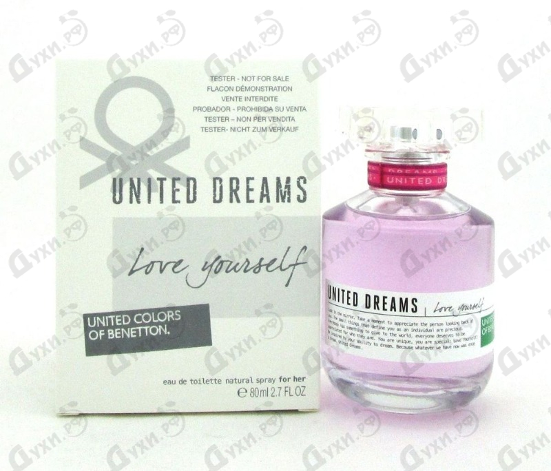 В 2014 году итальянский модный дом Benetton представил коллекцию из трех удивительно ярких и жизнерадостных ароматов United Dreams. Каждая парфюмерная формула стала сосредоточенным нежности, деликатности и эмоциональности. Она призвана дарить радость, погружать в положительные эмоции. Ароматная аура Benetton United Dreams Love Yourself является сосредоточением женственности и чувственности, она призывает любить себя, оставаться позитивной и жить счастливо. Нежная композиция раскрывается сладостным аккордом фруктовых нот. Дерзкий бергамот окружен сладостью груши, малины и абрикоса. Нежный сердечный букет - это лепестки жасмина, деликатный фрезии и розы. Завершается композиция классической мускусно-древесной базой в ореоле амбры. Композиция Benetton United Dreams Love Yourself словно сияет в лучах солнца, она посвящена любви к себе, ощущению истинной свободы и радости. Изысканное звучание ложится близко к коже и угасает удивительно медленно. Парфюмеры рекомендуют эту композицию для молоденьких девушек и маленьких принцесс.