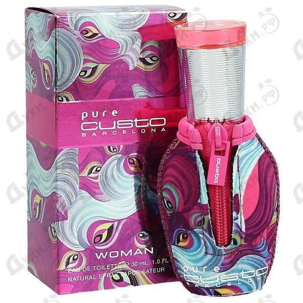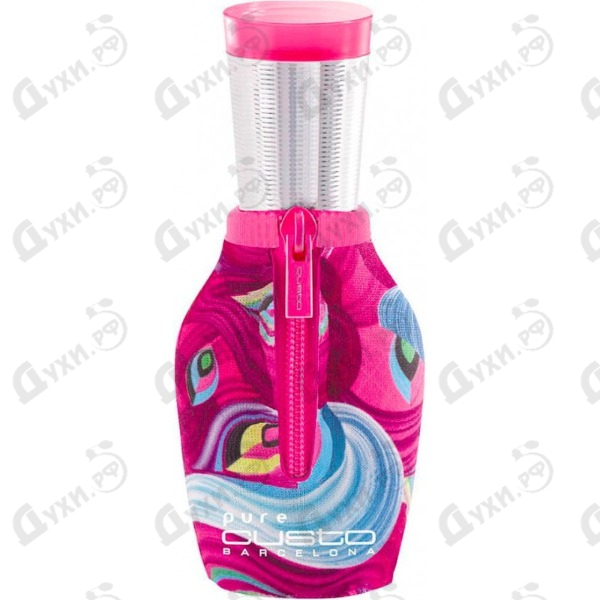 Парфюмерный букет аромата заключен в яркий и дерзкий флакон, выполненный в форме капли и в своем декоре сочетающим ткань, молнию, металл и яркий пластик. Цвет фуксии стал основным в оформлении флакона Custo Pure Custo, однако он подчинен идее павлиньих перьев, которая присуща в тканевом дизайне флакона. Нижняя часть его декорирована пестрой тканью, застегнутой на не менее яркую розовую молнию. Крышечка флакона выполнена из резного металла и украшена розовым пластиком.