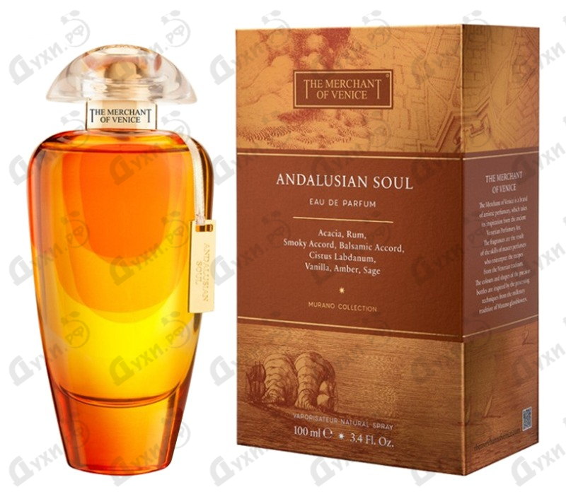 Изысканный парфюмерный флакон цвета теплого солнечного янтаря скрывает себе восхитительную композицию, вдохновленную бескрайними природными красотами волшебной Андалуссии - самого южного испанского региона с многовековой историей и старинными традициями. Издание получило название The Merchant of Venice Andalusian Soul и появилось на полках парфюмерных бутиков в 2018 году вмиг приковав к себе все внимание самых почтенных мировых критиков. В капельке мистического восточно-цветочного эликсира блистают все самые яркие краски морского южного заката, а пьянящие нотки дорогого хмельного рома усиливают эффект безграничной радости и ощущения счастья в душе. Вдохновением для парфюмерной истории послужил знаменитый морской путь Muda di Barbaria, который соединял собой солнечное Марокко и Южную Испанию. Суда перевозили по этому маршруту тонны различных целебных благоухающих трав и специй, смолы и драгоценную древесину, а также прелестные цветы. Теплая атмосфера этого аромата переносит нас к солнечным пляжам испанской Ривьеры, а вершина пирамиды растекается густыми потоками цветущей акации и крепкого гаванского рома. За началом следует сердце парфюма, которое звучит гипнотическими волнами чарующего лабданума и ценного шалфея. Уютный бальзамический шлейф The Merchant of Venice Andalusian Soul окутывает полотном из ароматной ванили и чувственной восточной амбры, которые делают образ обладателей духов еще более индивидуальным и запоминающимся.