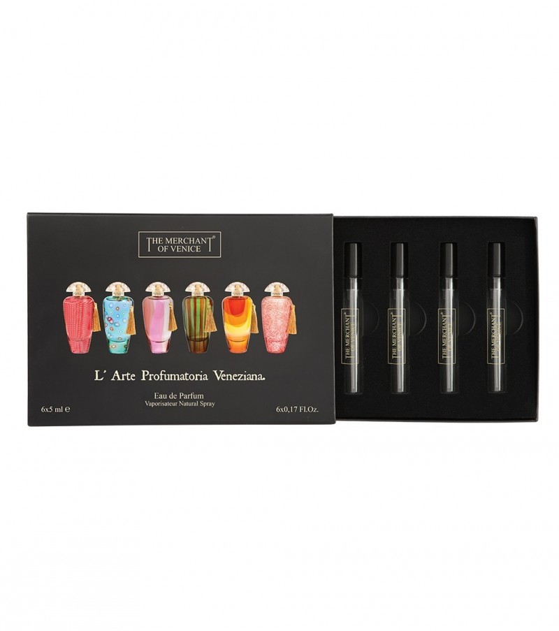 Парфюмерный набор The Merchant of Venice собрал в себе миниатюрные пробники изысканных премиальных композиций, формирующих знаменитую коллекцию Murano Collection. Композиции представляют собой ольфакторные путешествия, финальной точкой которых неизбежно становится колоритная итальянская Венеция. Началом пути служат несколько самых колоритных и ярких восточных городов с их неповторимой аутентичностью и особенной культурой. Венеция, как символ средневековой торговли, в те времена служила “Центральным звеном” между странами Европы и Азии. Парфюмеры итальянского нишевого дома не упустили из виду этот важный момент в истории родного города, представив поклонникам шестерку ярких и неординарных европейских запахов с обворожительным восточным акцентом. В состав коллекции входит чувственный цветочный эликсир Flower Fusion, собравший в себе все самые изысканные и бархатистые оттенки прелестных цветов: пьянящую розу, жасмин, медовую фрезию и фиалку, заключенную в теплые объятия бурбонской ванили. Жаркий пряный запах Byzantium Saffron - это парфюмерная история о редком византийском шафране, где, помимо этой доминирующей ноты, переливаются огнями страсти оттенки смолистого пачули, замши и классической амбры. Цветочно-фруктовый “коктейль” Mandarin Carnival перенесет нас на территорию солнечной Сицилии, известной своими плантациями цитрусовых мандаринов. Дорогой и изысканный цветочно-мускусный аромат Noble Potion идеально подойдет для самых торжественных случаев, а нежный цветочный Suave Petals, напротив, покоряет своей искренностью и безупречен в формате повседневных образов для прогулок. Завершает линейку строгий зеленый “фужер” Asian Inspirations с явными оттенками апельсина, шалфея и дымного ветивера.